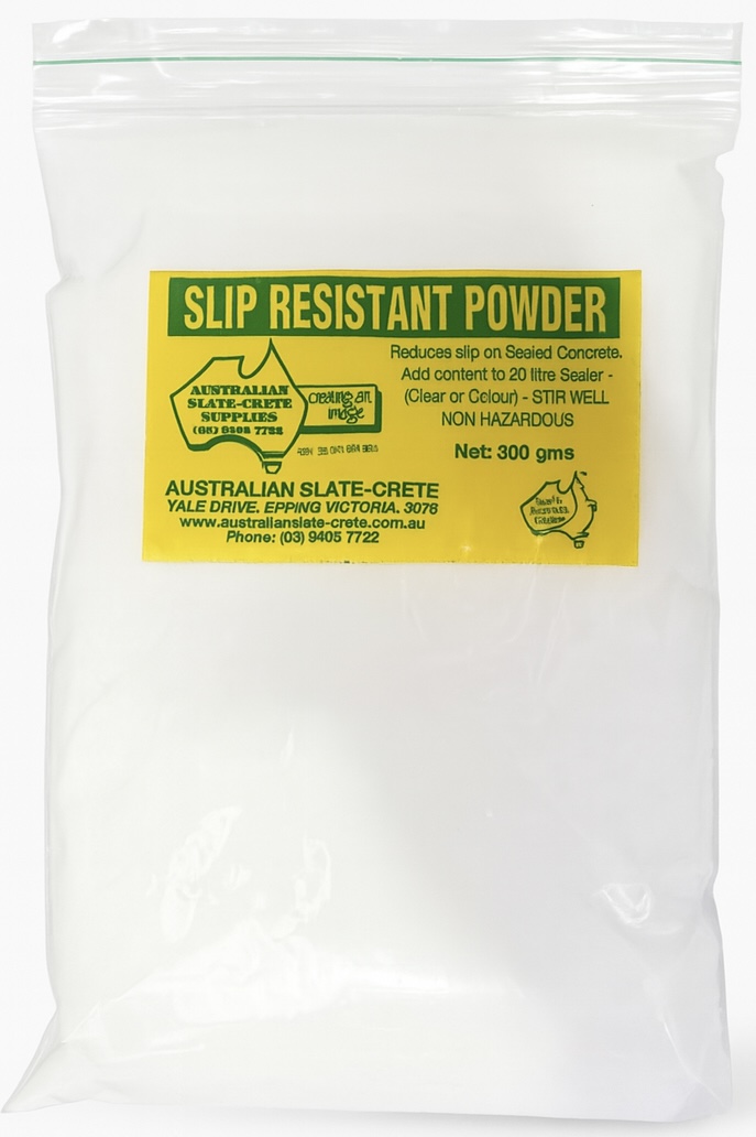 Slip Resistant Powder is added to the concrete sealers to increase grip on slippery surfaces.Some concrete can become slippery when a sealer is applied to it, slip resistant powder can help to decrease this.Applying Slip resistant powder is a trade off with the gloss level. The more slip resistant powder you add,the more grip it will provide, but it will deflect the light and reduce the gloss. One 300g bag is designedto treat a 15-20lt drum, at a sweet spot to provide maximum grip and minimal visibility. More Slip resistant powdercan be added to the sealer if required, but the more you put in, the more noticeable it becomes.